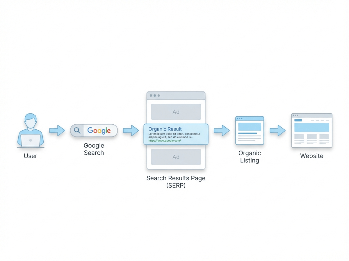 Example of organic traffic flow: user search → search engine results → organic listing → website.