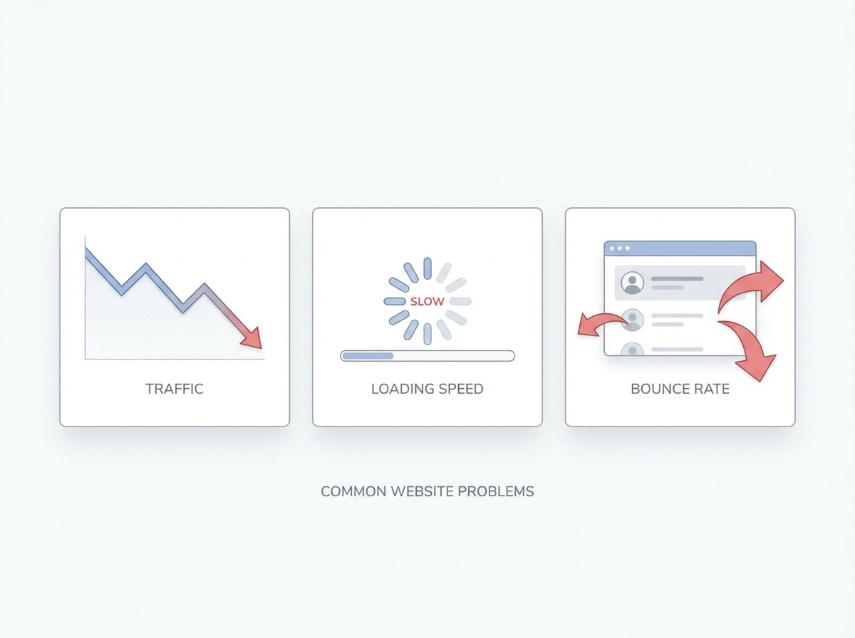 Illustration of common SEO problems: low traffic, slow website speed, and high bounce rate