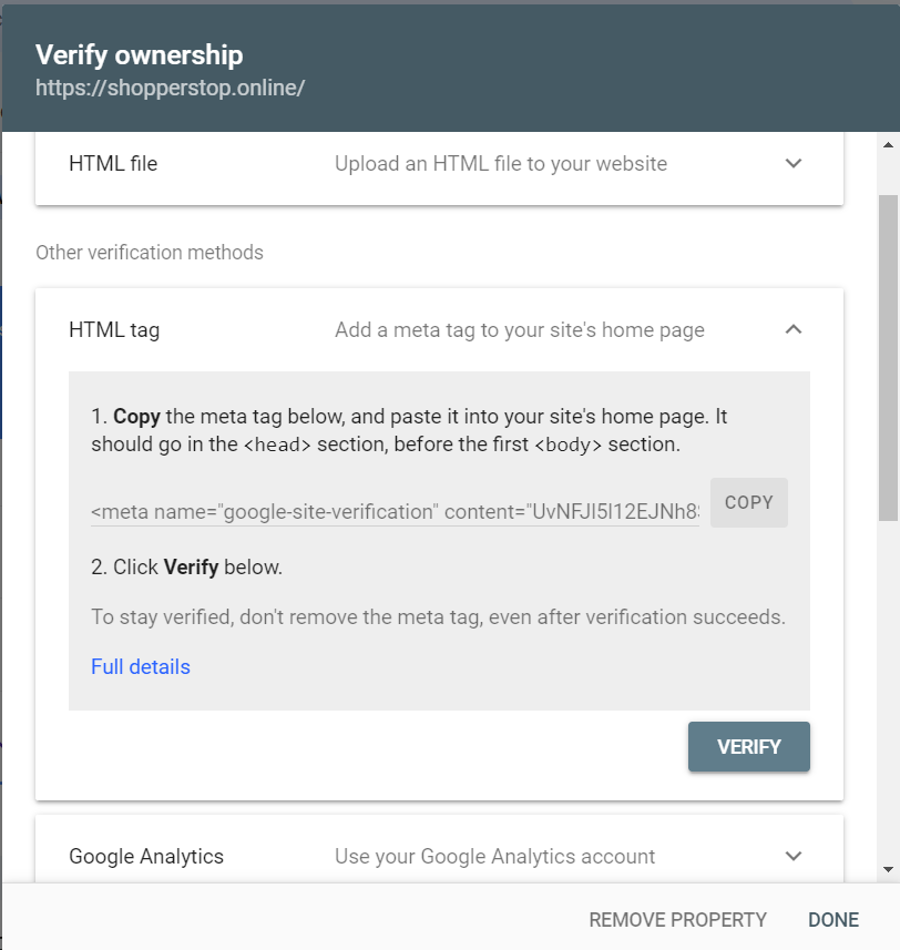 - d. Google Analytics If your site is already connected to Google Analytics, automatic verification can be performed.