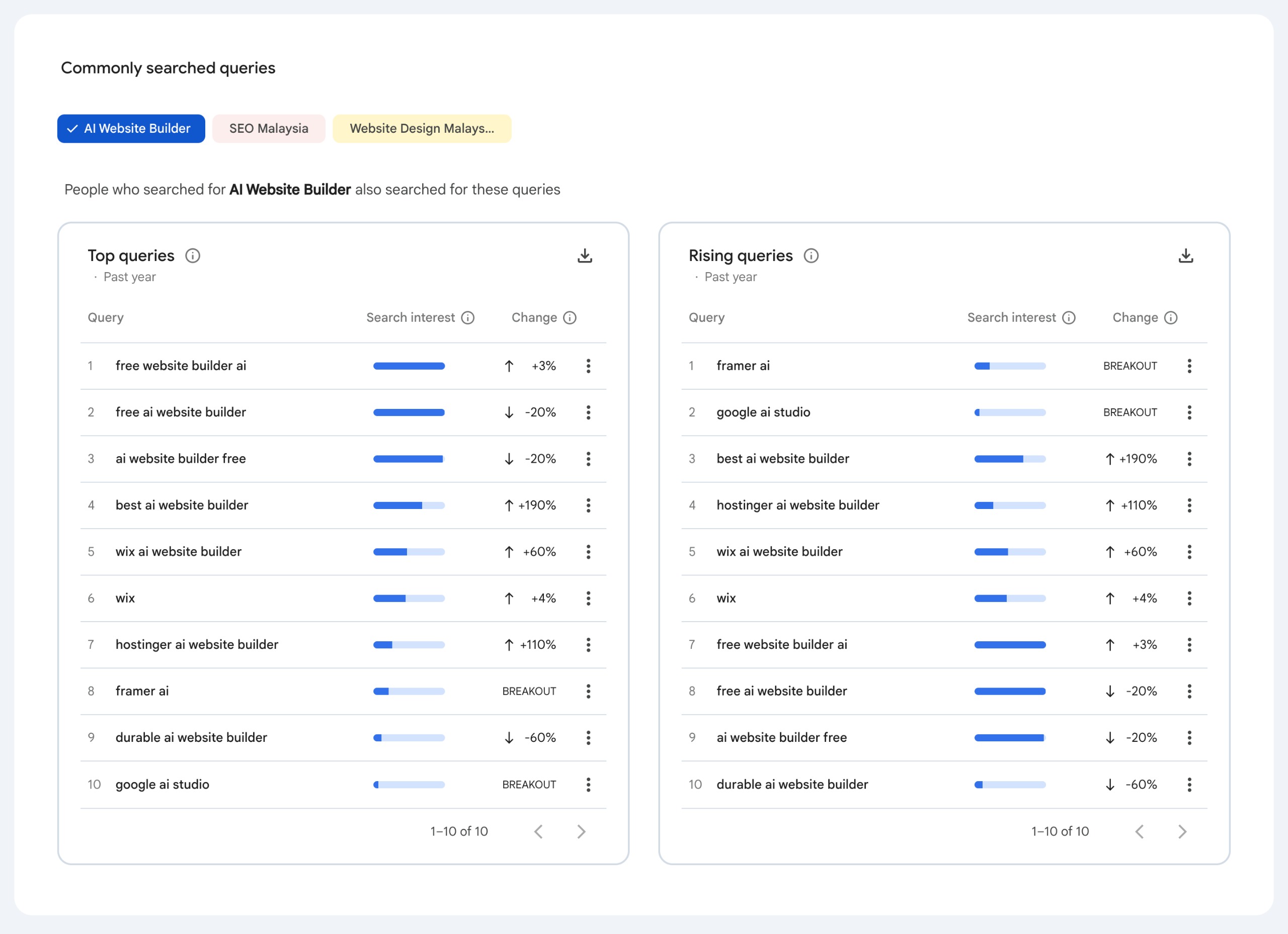 - Example: A +45% increase in searches for "AI website builder" in Kuala Lumpur over the last 3 months indicates high market interest.