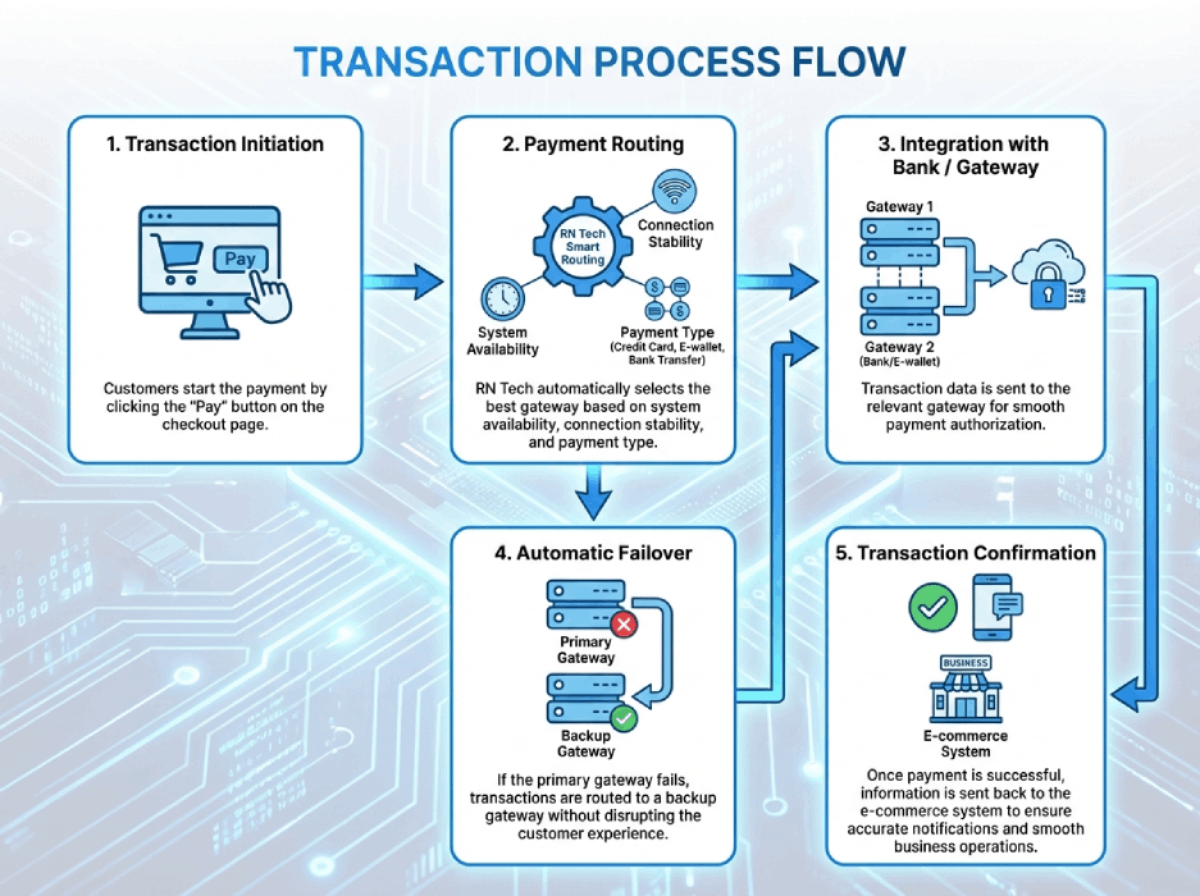 - Automatic Failover If the primary gateway experiences downtime or issues, RN Tech immediately routes the transaction to a backup gateway without disrupting the customer experience.